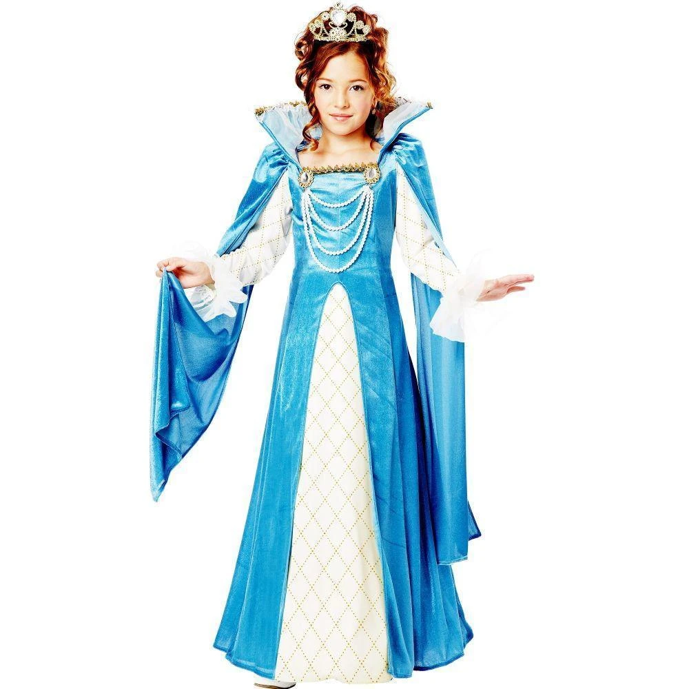 Become a beautiful, royal monarch with this Renaissance Queen costume. The outfit includes a long blue and white dress with an attached collar, as well as a detachable necklace and an imperial gold crown. You will exude royalty in this wonderfully detailed costume.