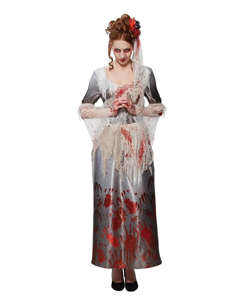 - Headpiece is a floral design with attached side veil, also with faux blood splatter