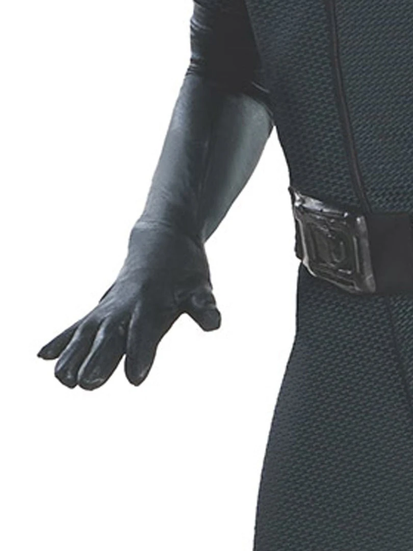 - Jumpsuit with stand away collar and full length sleeves with faux leather gloves attached