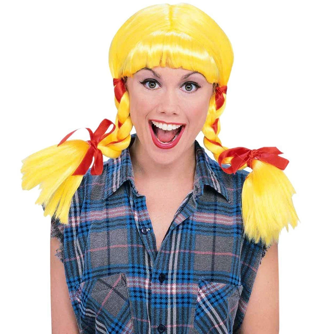 - Wig is parted in the middle with two side plaits and a thick fringe