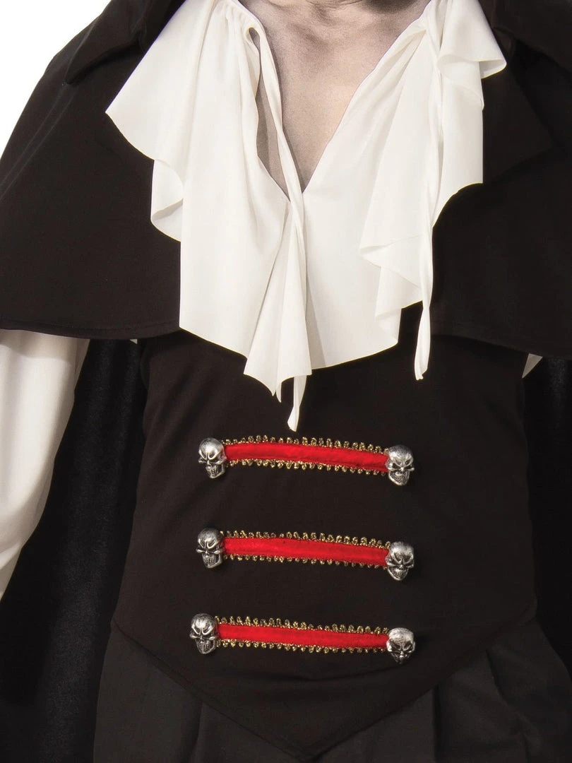 - Attached vest with painted silver skeleton buttons & red satin attachments