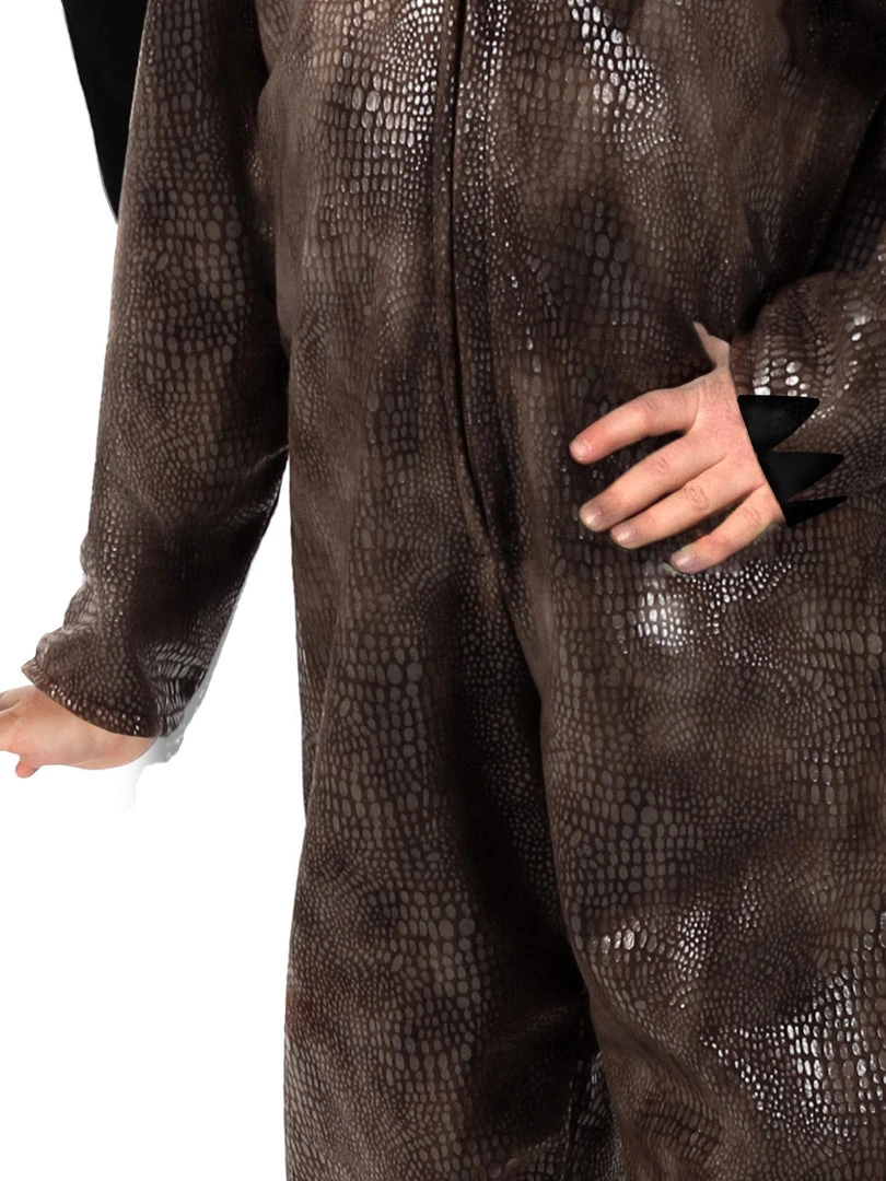 - Onesie features attached hoodie with 3D dragon facial characteristics and headpiece in felt plus attached horns