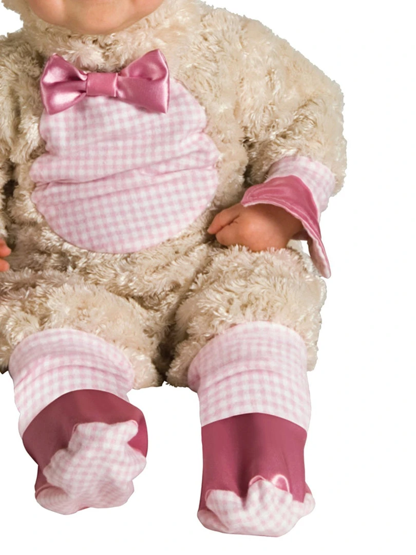 - Separate Headpiece has plush lamb floppy ears with printed fabric and satin bows
