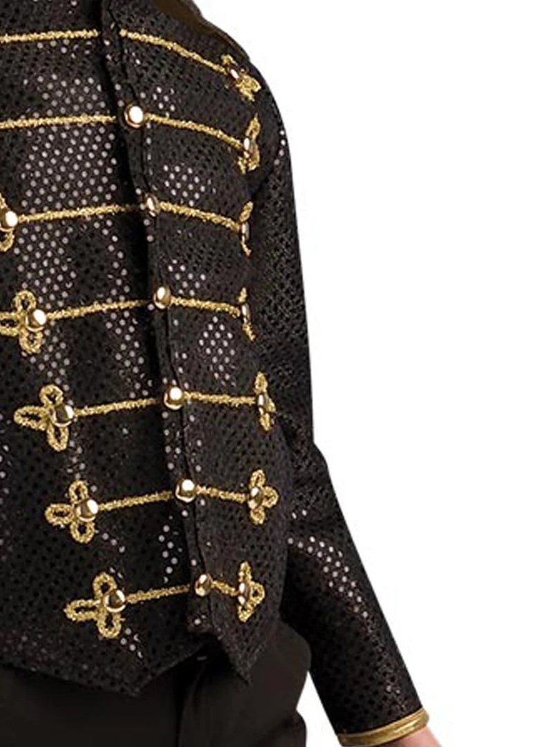 - Jacket has military look sewn on stripes and buttons on torso and sleeves plus gold fabric attached to shoulder piece