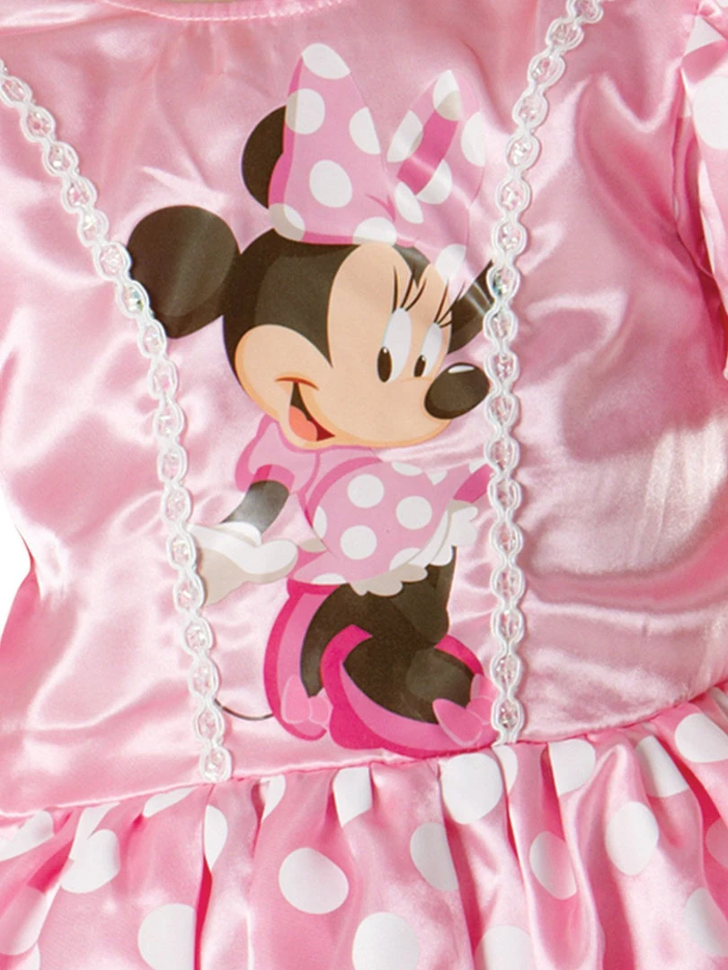 - Iconic Minnie Mouse dress made from satin material featuring trademark white spots on skirt and puffy sleeves. Centre of bodice features digitally printed Minnie Mouse print on satin material and stitched in panel with embroidered trim