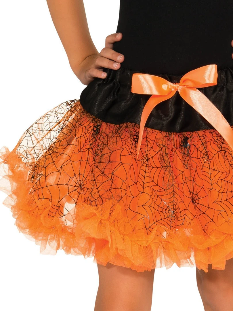 - Orange tulle trimmed mini skirt with black spider webbing print throughout