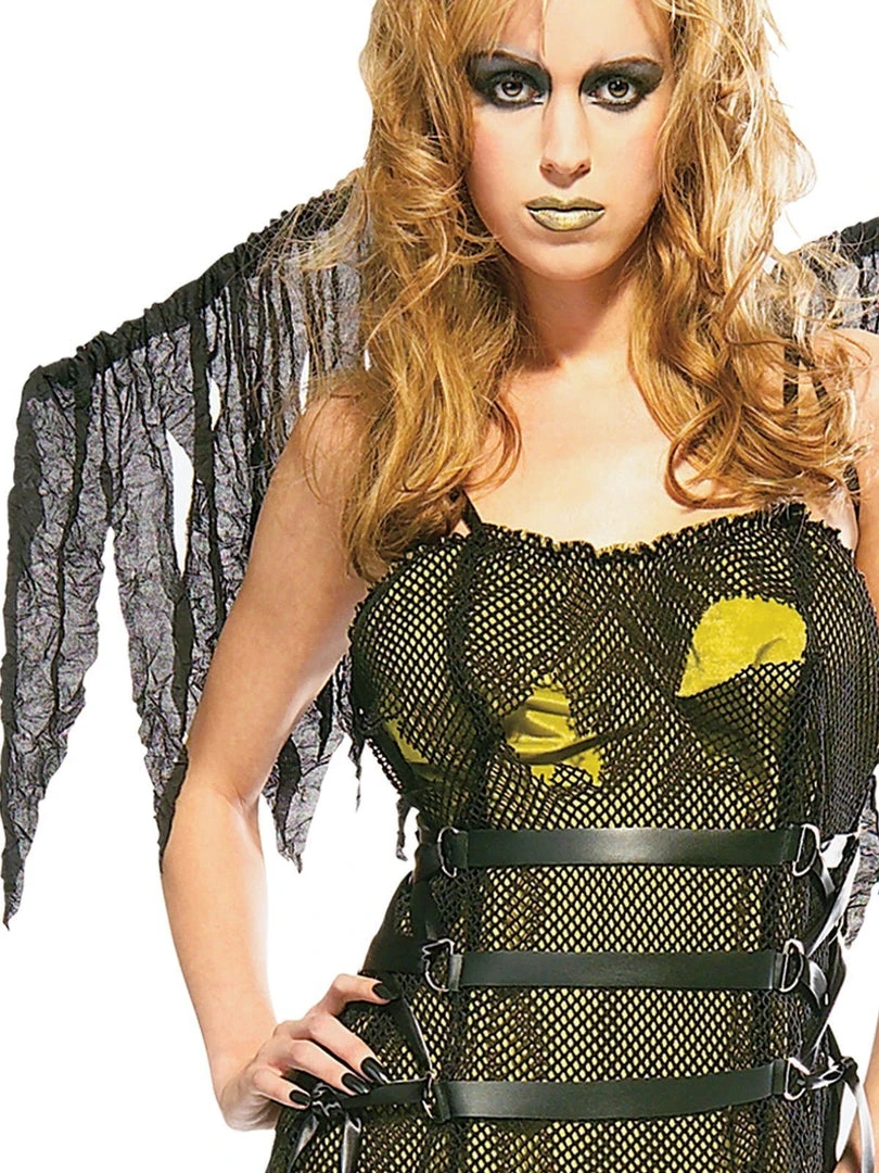 - Broken and tattered black wings on bent frames attach with straps over shoulders